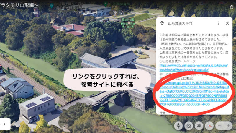 番組内ではどうしても地面レベルの画角が多くなるから、GoogleEarthのように別の角度から地域を見ることもよいと思うぜ。