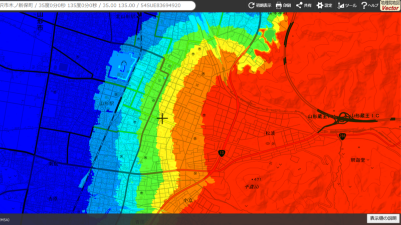 山形城周辺の標高について、地理院地図で主題図を作ってみたよ。